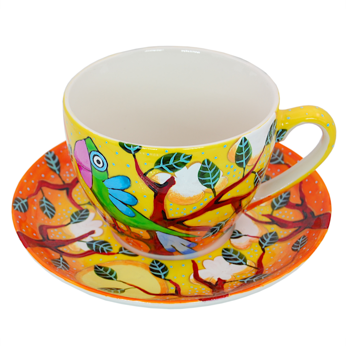 Enjoy your coffee and tea ritual with this beautiful and original set of porcelain cup and saucer. It is 100% handcrafted and created with dedication in a small atelier of Blue Bird. All the image details are painted manually using the author’s own technique. Each piece of collection is unique and very decorative. Let this charming set help you relax and enjoy full aromas of good quality tea and coffee. By purchasing this product, you directly support the artist and her work. Handle with care. Not suitable for dishwashers.